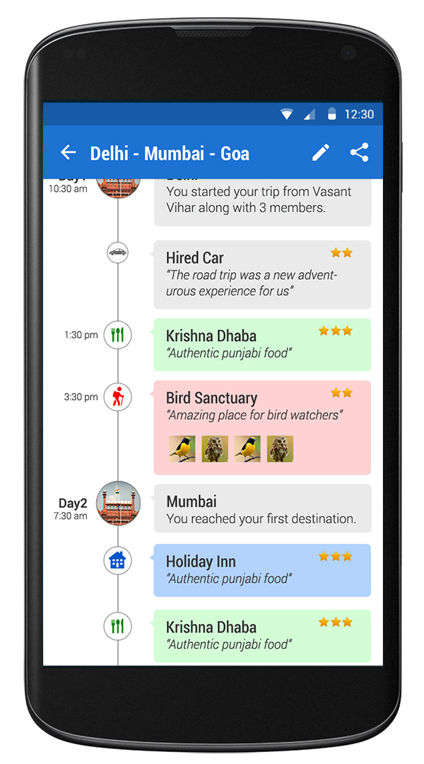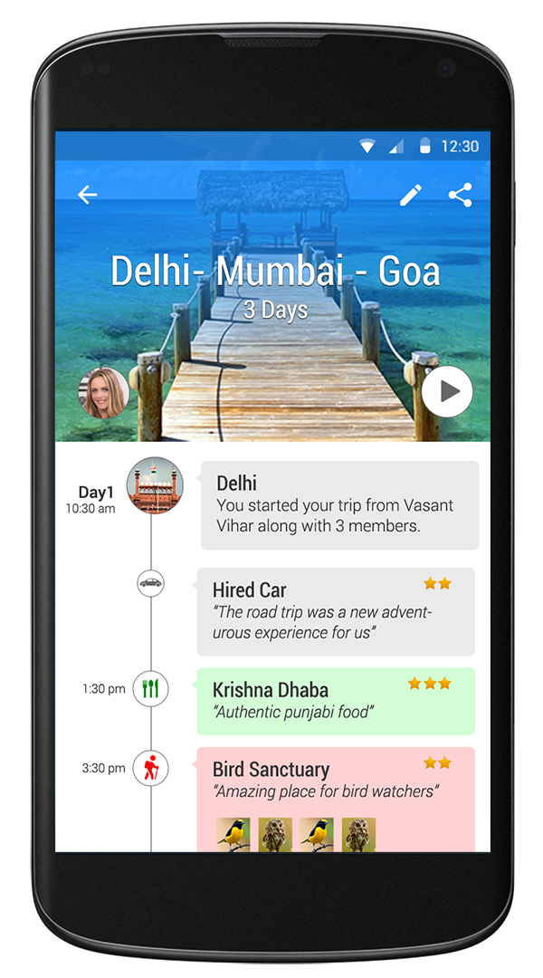While you enjoy your trip, Triplived creates your travel story on your smart phone. It automatically detects your activity, captures your location, does automatic check-ins, and tags your photographs. Your reviews and suggestions complete the story, that can then be shared with friends and family.